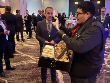 Roaming cannoli server filling mini cannoli throughout your event with your choice of garnish for the sides. Service is for 2 hours. $350 minimum food order as well as a $250 serving fee.